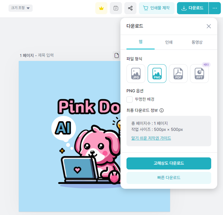 이제 원하는 파일 형식을 선택 후, 고해상도 다운로드를 받으면 '나만의 캐릭터 만들기'가 완성됩니다^^