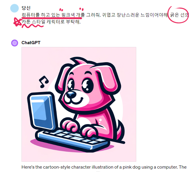 그렇게 저도 챗gpt의 제안과 저의 아이디어가 합쳐져서 '핑크독'이라는 캐릭터명이 탄생했구요, 캐릭터 특징도 곰에서 강아지로 변경되었답니다^^