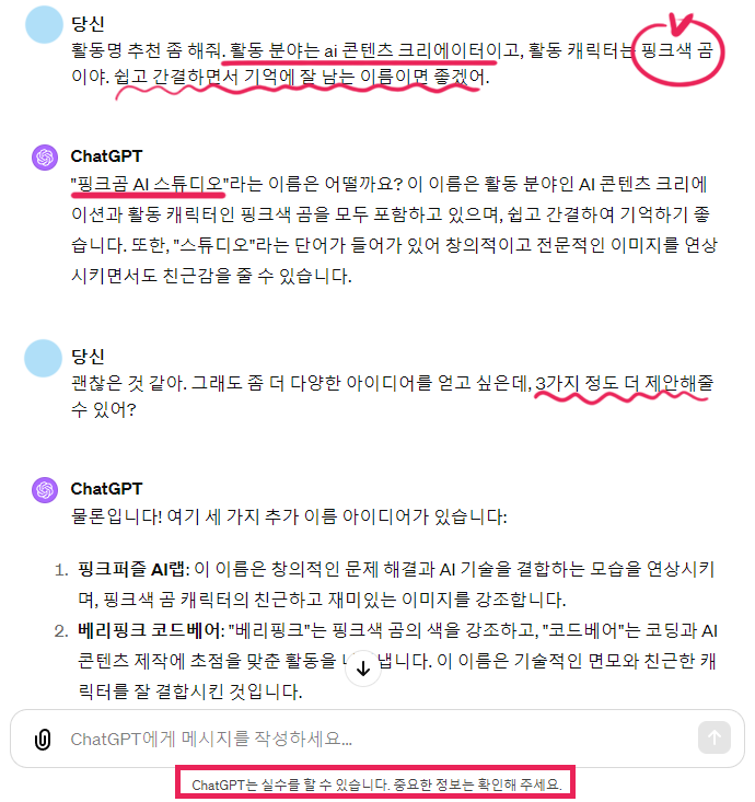 저는 < ai 콘텐츠 크리에이터, 핑크색 곰 >이라는 간단한 특징을 부여해주었는데요, 캐릭터의 초기 설정도 어렵다면 그것도 챗gpt한테 물어보면 됩니다. 처음부터 너무 형식적인 질문과 해답을 도출하려고 하면 질문하는 것조차 어렵게 느껴질 수 있어요~ 처음에는 본인의 생각을 그대로 적는 것이 도움이 되는 것 같아요. 마치 내 고민을 진지하게 들어주는 친한 친구나 오래동안 함께 일해 온 동료 및 비서한테 말하듯이요~ 말을 많이 할수록 언변이 늘어나듯이, 질문도 많이 하다보면 점점 익숙해지고 더 나은 질문화법을 익힐 수 있을거에요!