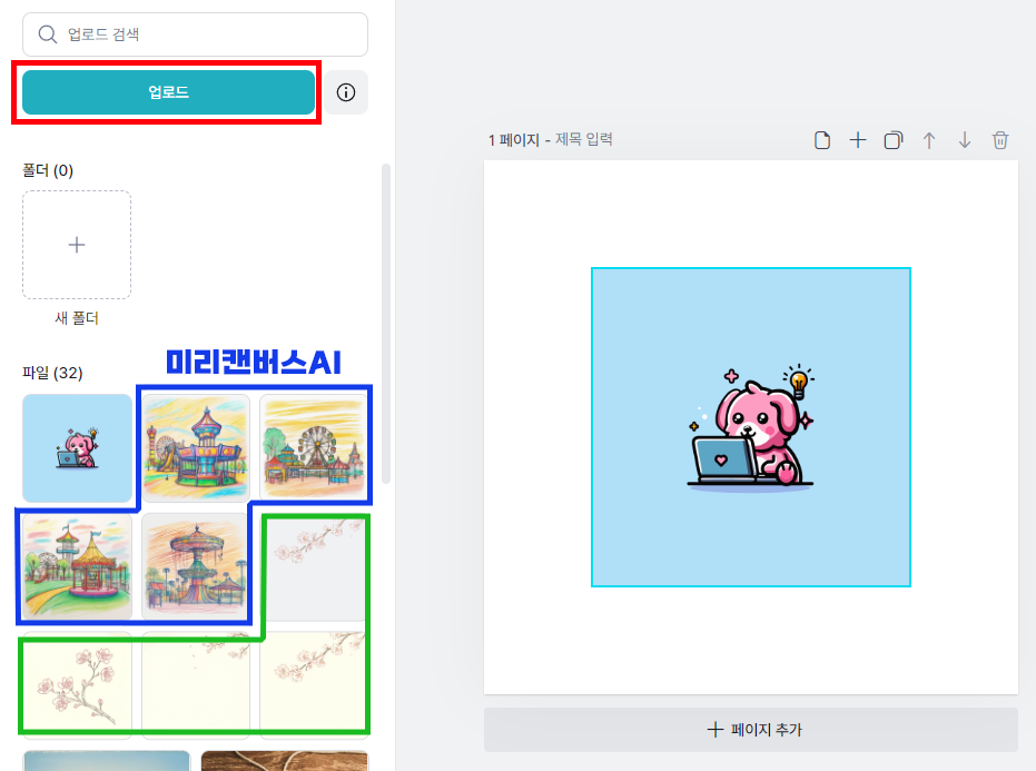 참고로 미리캔버스에서도 AI 그림 생성이 가능하답니다~ 파란색 테두리로 표시해둔 이미지가 미리캔버스에서 생성한 그림이구요~ (놀이공원, 색연필 컨셉을 입력함), 초록색 테두리 안의 이미지도 AI그림이랍니다. 어디서 생성했었는지 기억이 정확하지 않아서...ㅎㅎ AI그림은 사용하는 플랫폼에 따라서, 프롬프트 작성법에 따라서 다양하게 생성이 가능하다는 것이 매력적이에요^^
